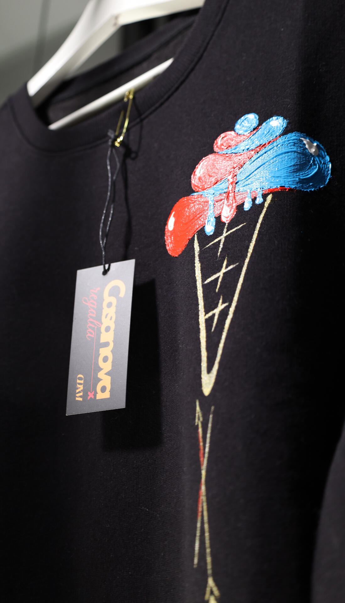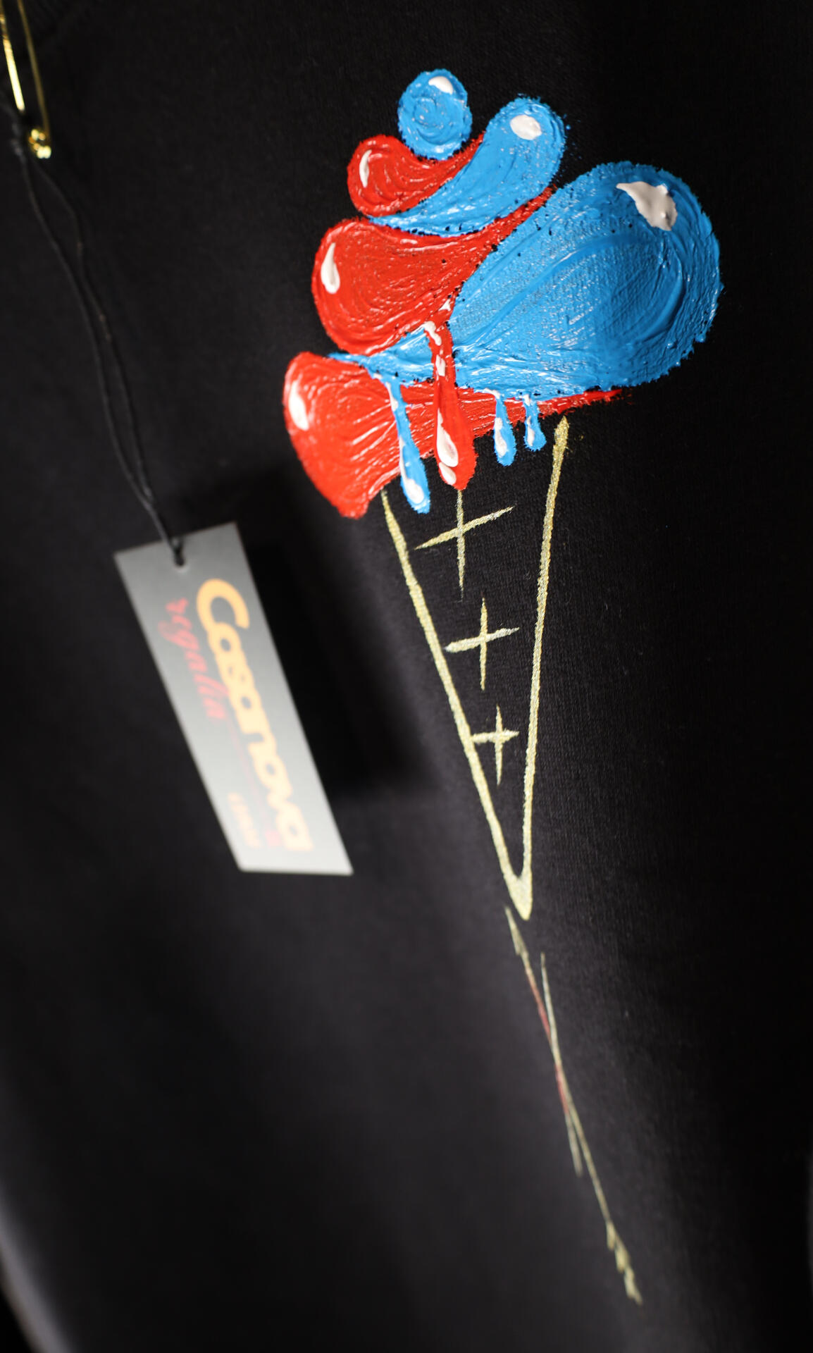 ; a hand painted piece, each article is laboriously achieved over a five day process allowing for application of multiple layers of colour and texture; this process allows for distinguishing and unique features to each article.The release of the upcoming collection, release date to be announced, will include a full track suit made from 100%, 400 GSM cotton, with a Gelato CDXVI patch. All materials are strictly sourced in Toronto.